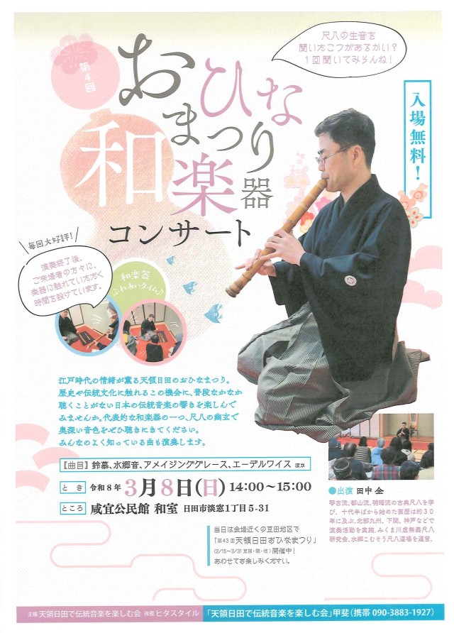 【入場無料】尺八の生音に触れる「第4回 おひなまつり 和楽器コンサート」のご案内