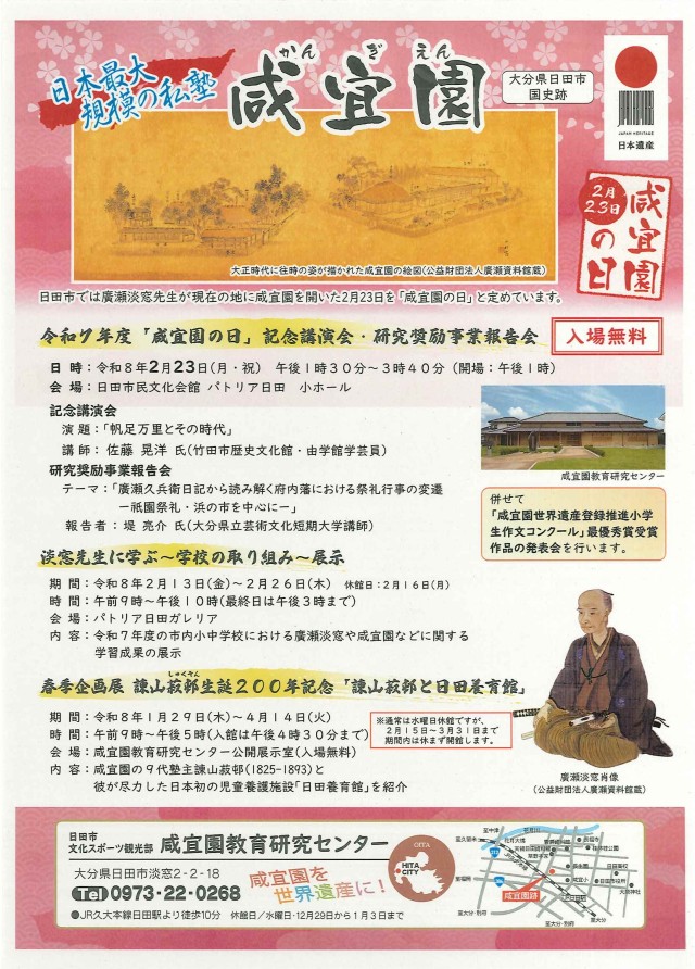 日田市では、廣瀬淡窓先生が現在の地に咸宜園を開いた2月23日を