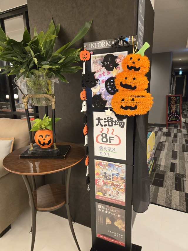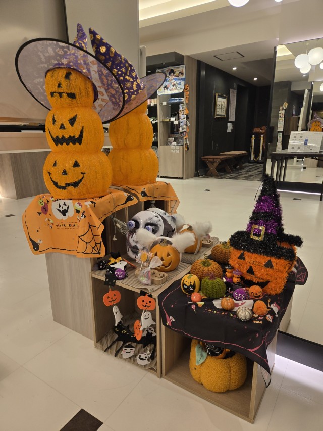 オレンジ色のかぼちゃや可愛らしいおばけたちが、館内を華やかに彩っています。