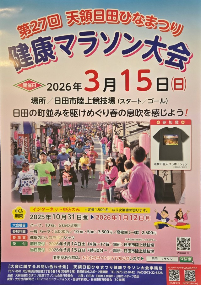 #天領日田ひなまつり健康マラソン #日田マラソン #日田市 #大分マラソン #ひなまつりマラソン #天領日田 #春のマラソン大会 #ハーフマラソン #進撃の巨人コラボ #九州マラソン #大分県 #日田観光 #マラソン大会2026 #ランニングイベント #日田市陸上競技場