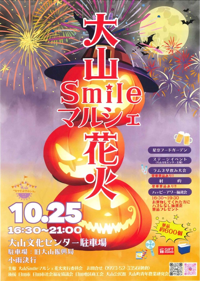 大山町の皆さま、そして日田市にお住まいの皆さまに嬉しいお知らせです。2025年10月25日(土曜日)、大山文化センター駐車場にて「大山Smileマルシェ花火 2025」が開催されます!