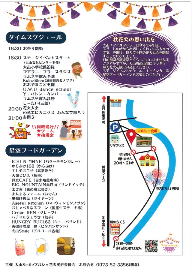 #OyamaSmileMarche #AutumnFireworks #HitaCity #OitaPrefecture #JapanFestivals #LocalEvents #FoodGarden #CommunityEvent #FamilyFriendly #JapanTravel #FireworksDisplay #LocalFood #JapanAutumn #RuralJapan #VisitOita