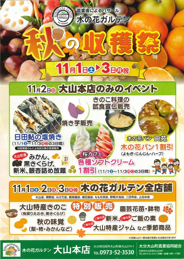 秋の恵みを堪能できる3日間。新鮮な農産物、美味しいきのこ料理、お得な割引サービスと、魅力がいっぱいの秋の収穫祭。ぜひこの機会に大山町の豊かな自然の恵みを味わいに、木の花ガルテンへお越しください!
