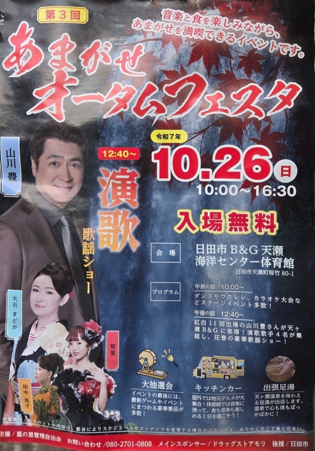 #あまがせオータムフェスタ #天瀬イベント #日田市イベント #山川豊 #演歌歌謡ショー #天ヶ瀬温泉 #大分イベント #入場無料イベント #キッチンカー #足湯 #地域イベント #秋祭り #音楽フェス #カラオケ大会 #抽選会